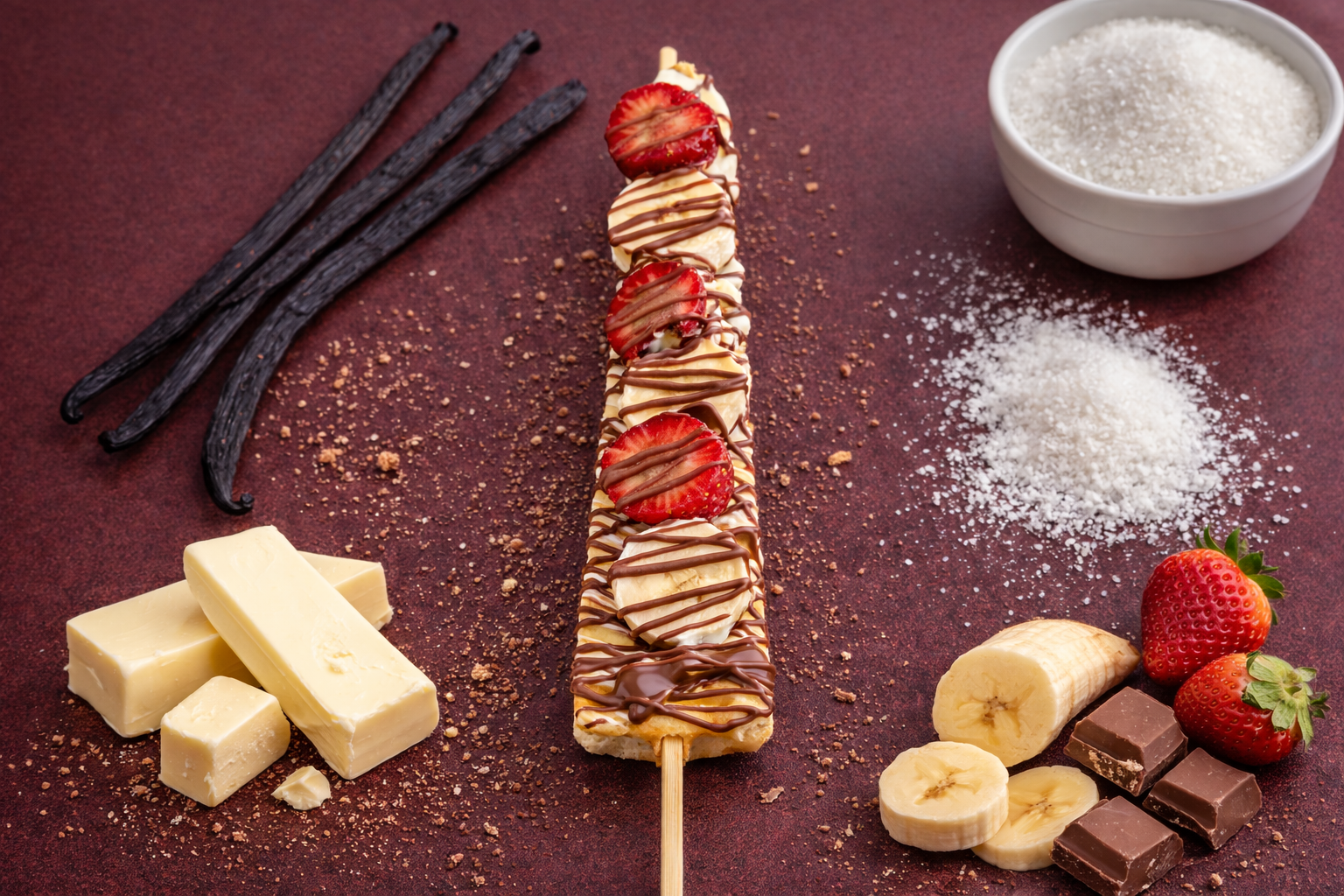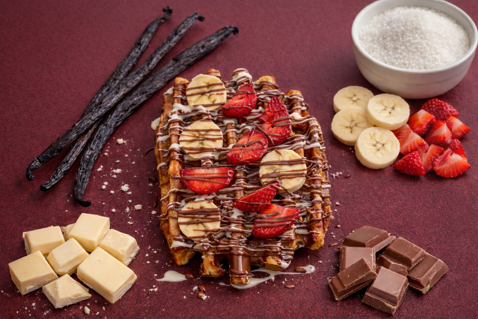 Onze strawbana gaat all-in met melkchocolade,witte chocolade én vers fruit. Zoet, fruity en mega genieten.