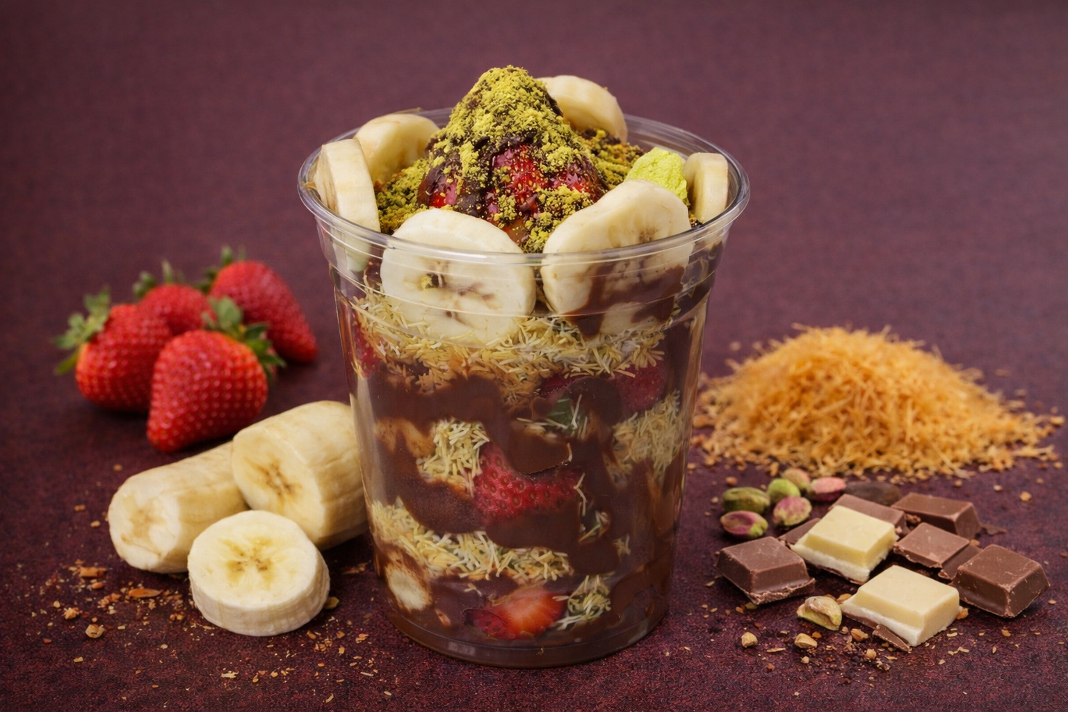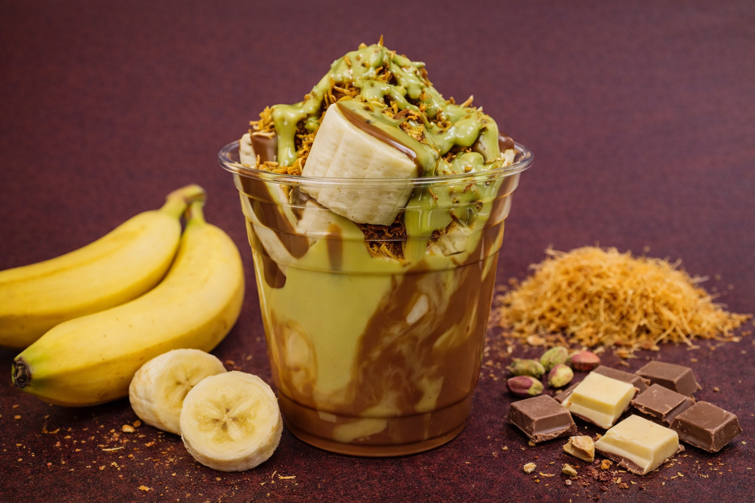 Cup met banaan, melkchocolade en pistachechocolade, topped met kadayif en pistachenootjes. Een echte showstopper!