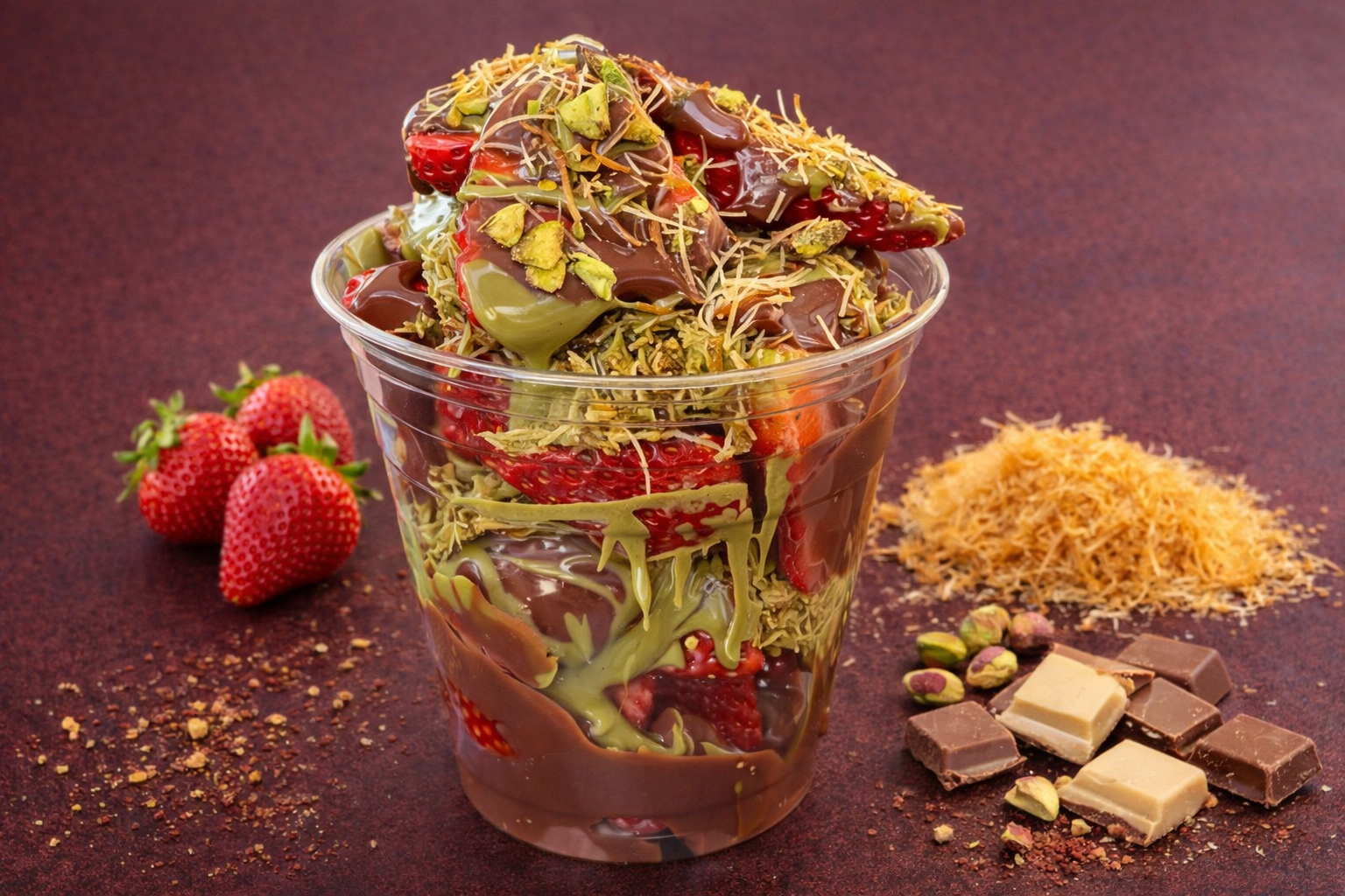 Onze Dubai Strawberry Cup is creamy, crunchy en super fresh: aardbei,pistache,kadayif en pure verwennerij in elke lepel.