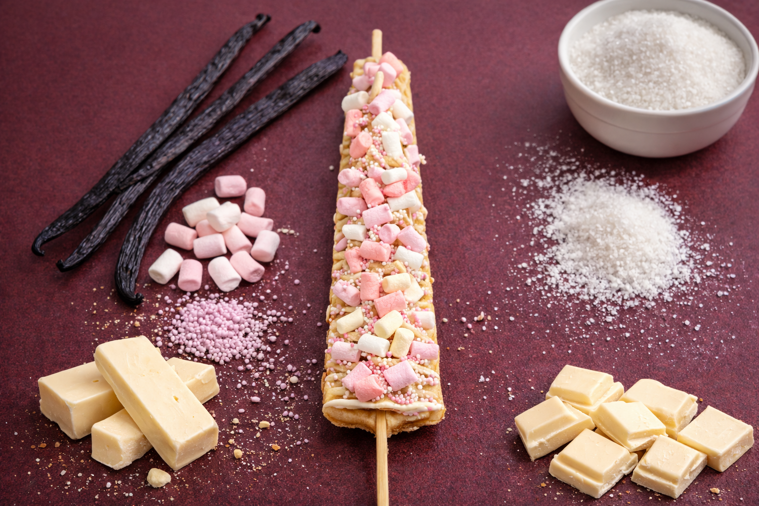 Onze Lolly Marshmallow met witte chocolade en sprinkles is zacht, zoet en onweerstaanbaar lekker. -